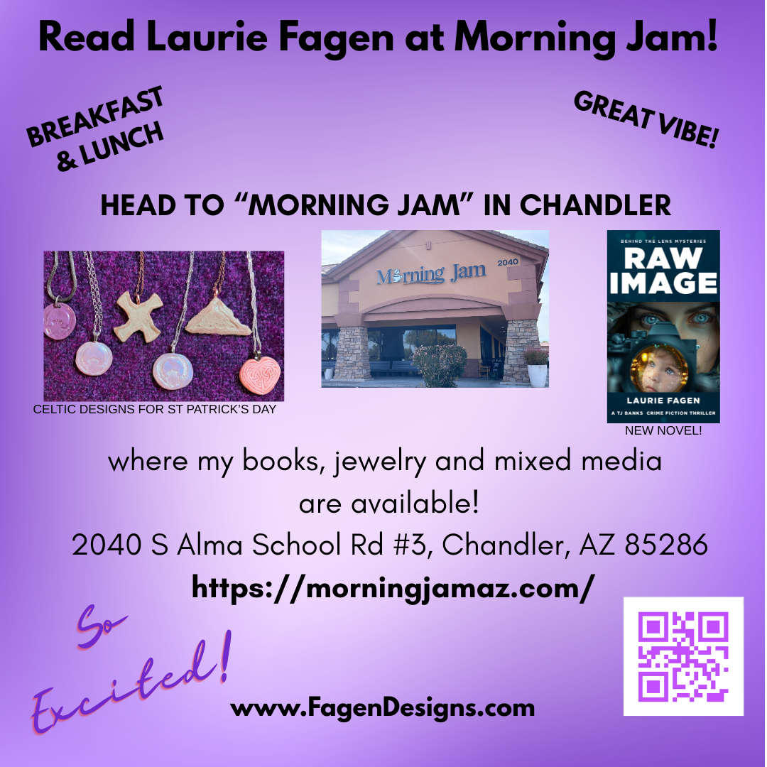 NEW LOCATIONS for my books: I’m pleased to have signed copies of my books available at Morning Jam, a terrific breakfast and lunch restaurant on the corner of Alma School and Germann in Chandler! Both series, Behind the Mic Mysteries and Behind the Mic Mystery Thrillers will be available along with my artwork. d’Vine Gourmet in historic downtown Chandler also carries my books, as does the Chandler Museum. Of course you can also find them all on Amazon: https://tinyurl.com/GetRawImageEbook